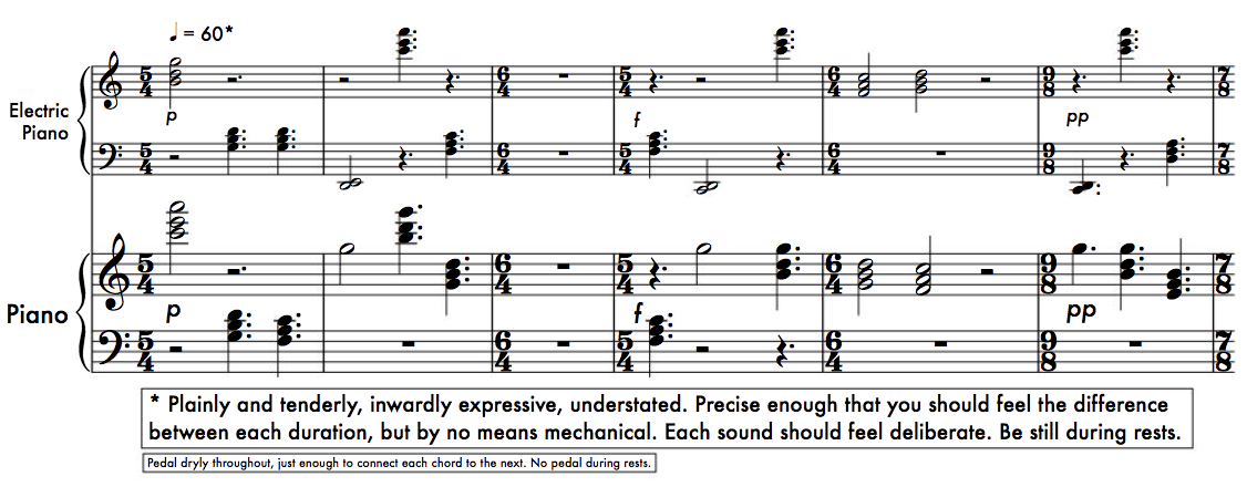 Daisy, Hold Into takes as its starting point the aesthetic tensions that emerge between electronic and acoustic sound – or more precisely, between pre-recorded material sounding from speakers and live material produced by traditional instruments. Rather than try and reconcile these two worlds, this piece lays bare the ontological differences between the two categories by means of simple juxtaposition. Extremely spare and austere musical material is distributed between an acoustic piano and an electronic copy of the same instrument, in a manner that foregrounds nuances of timbre and spatial diffusion.